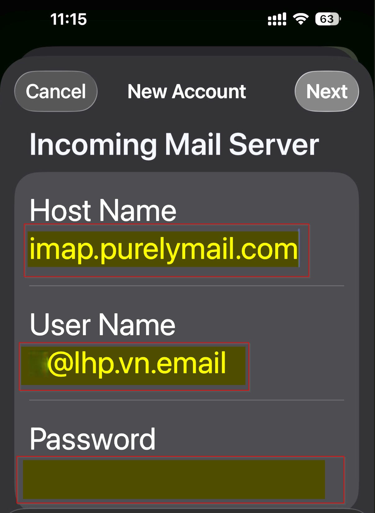 Bước 6: Nhập incoming server là imap.purelymail.com