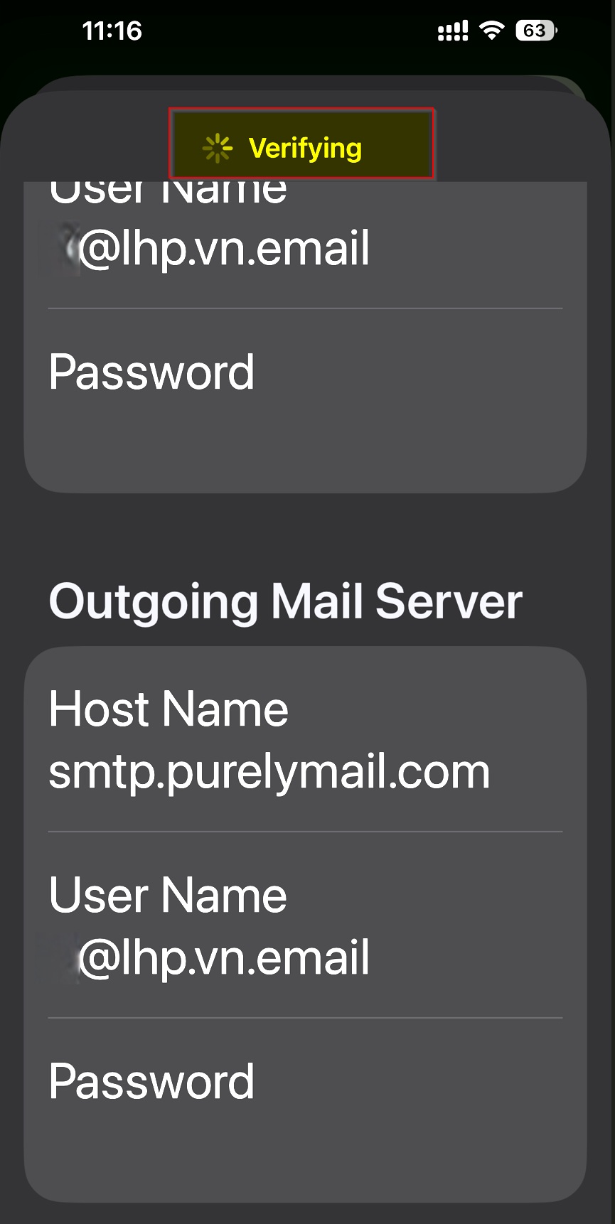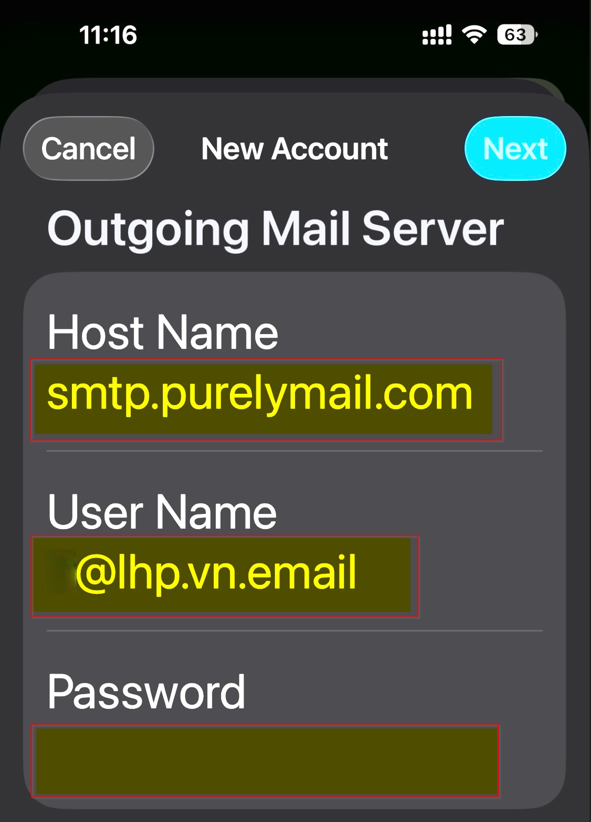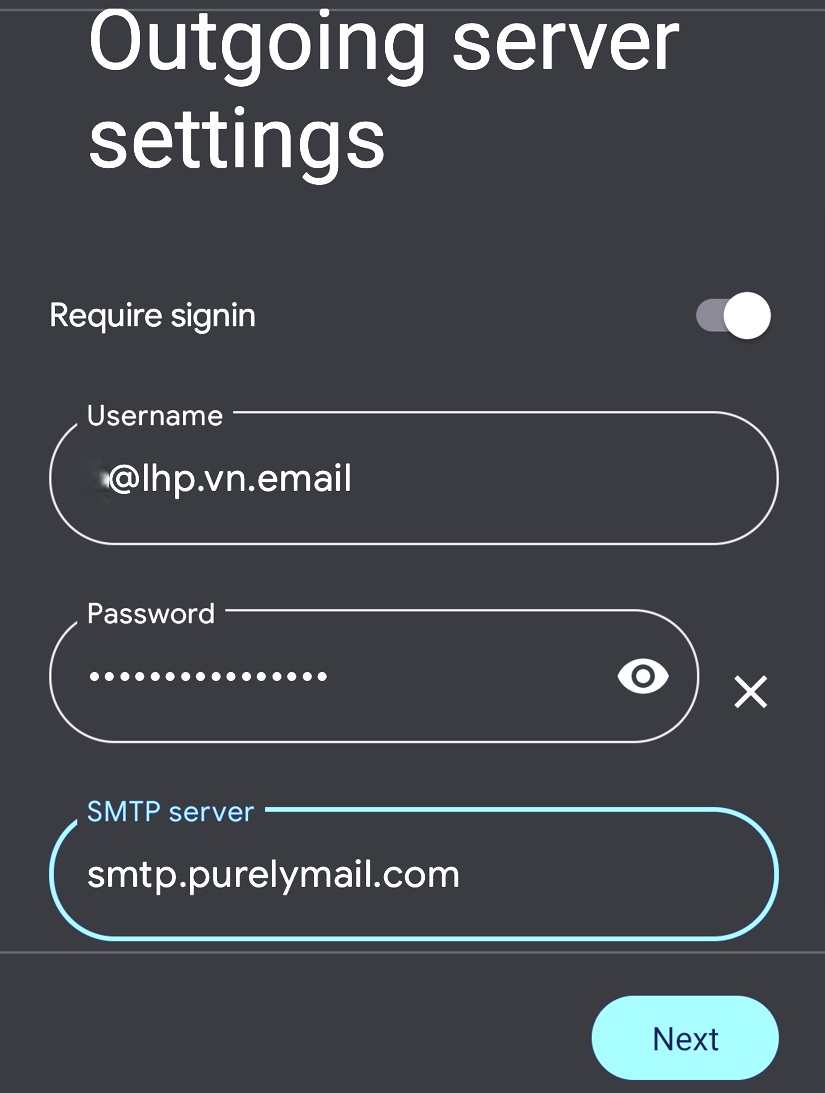 Bước 6: Nhập Outoging server là smtp.purelymail.com, Username là địa chỉ email @lhp.vn.email, và Password của bạn