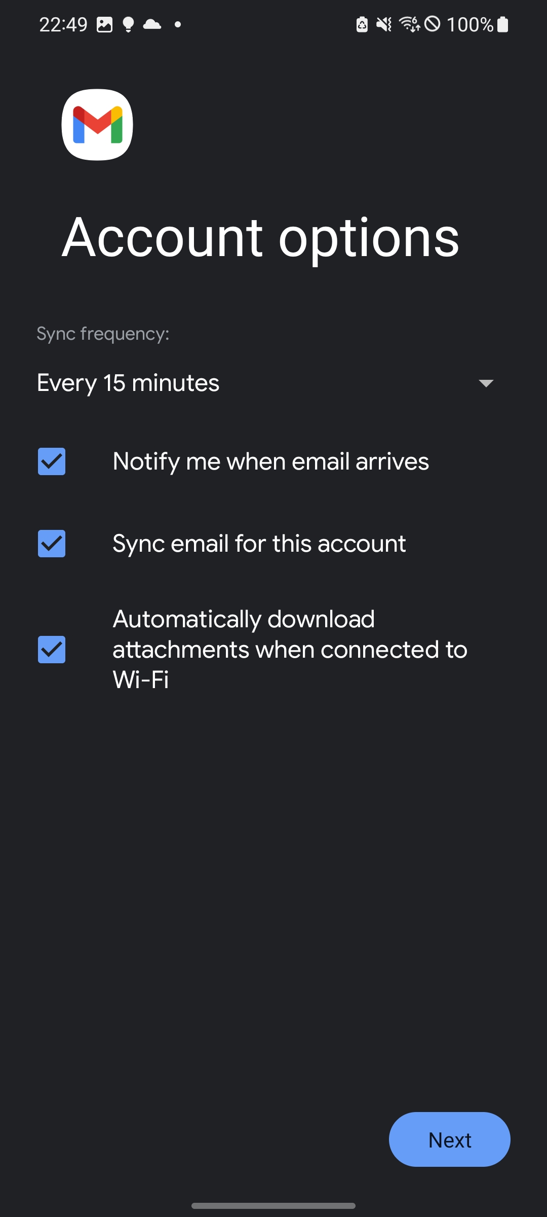 Bước 8: Chọn Sync frequency là 15 phút, các tùy chọn khác giữ nguyên